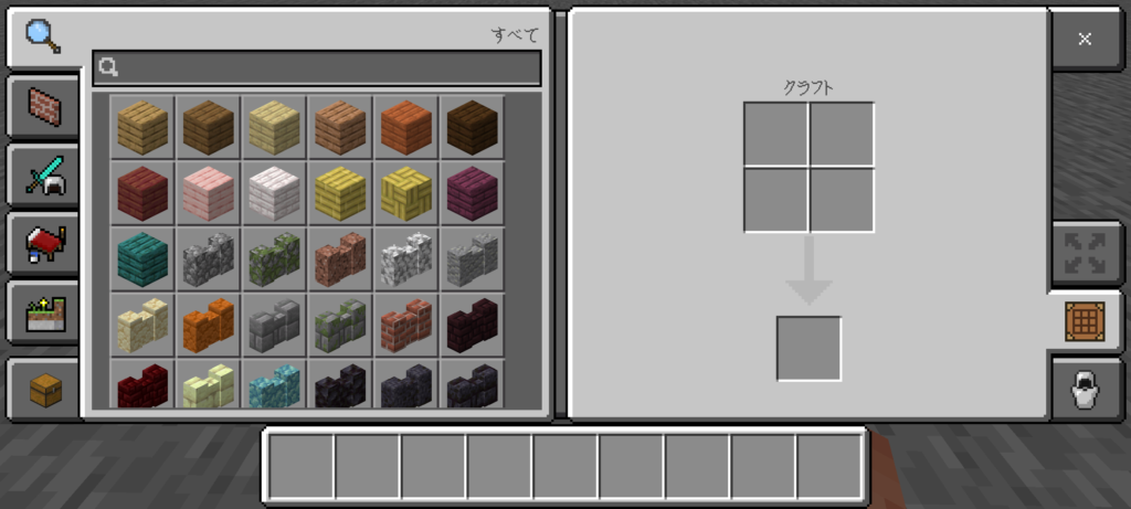 クリエイティブモードでは、すべてのブロックやアイテムを最初から使用できます。