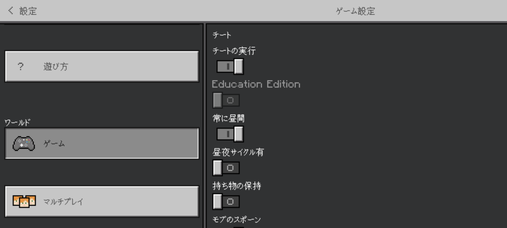 ゲーム内の時間設定以外にも、モブのスポーンや天候の変化のON・OFFなどの変更ができます。