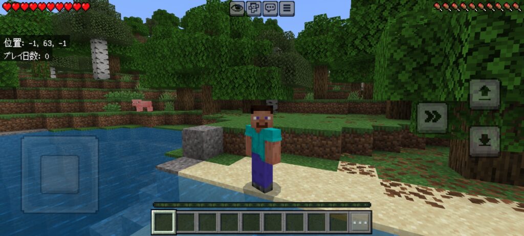 スマホ版マインクラフトの操作は、基本的に画面上に表示されているスティックやボタンで行います。