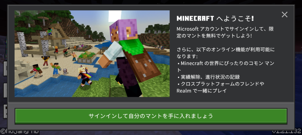 スマホ版マインクラフトを立ち上げると、タイトル画面上にポップアップで、Microsoftアカウントでのサインイン(アカウント作成)を求められる場合があります。